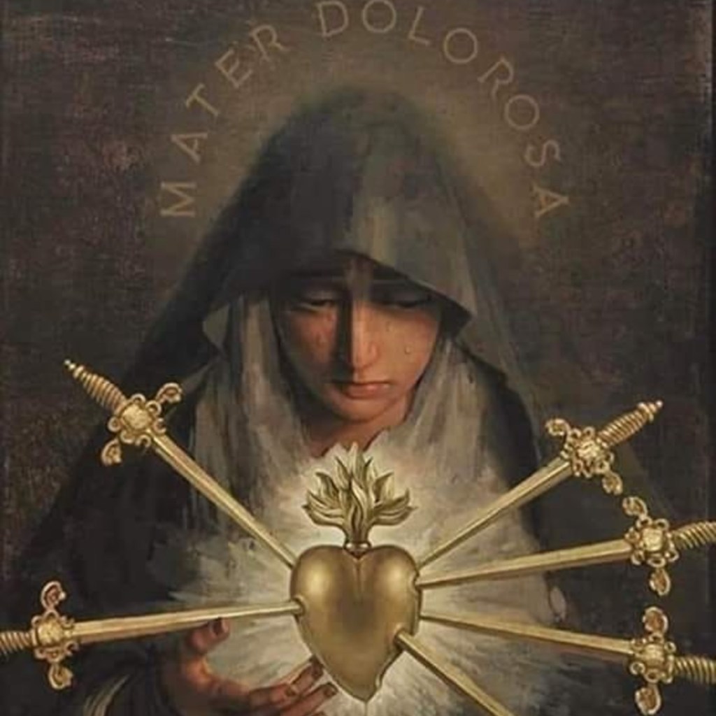 O most holy virgin, mother of our Lord Jesus Christ: by the overwhelming grief you experienced when you witnessed the martyrdom, the crucifixion, and the death of your divine Son, look upon me with eyes of compassion and awaken in my heart a tender commiseration for those sufferings, as well as a sincere detestation of my sins, in order that, being disengaged from all undue affections for the passing joys of this earth, I may long for the eternal Jerusalem, and that henceforth all my thoughts and all my actions may be directed toward this one most desirable object.